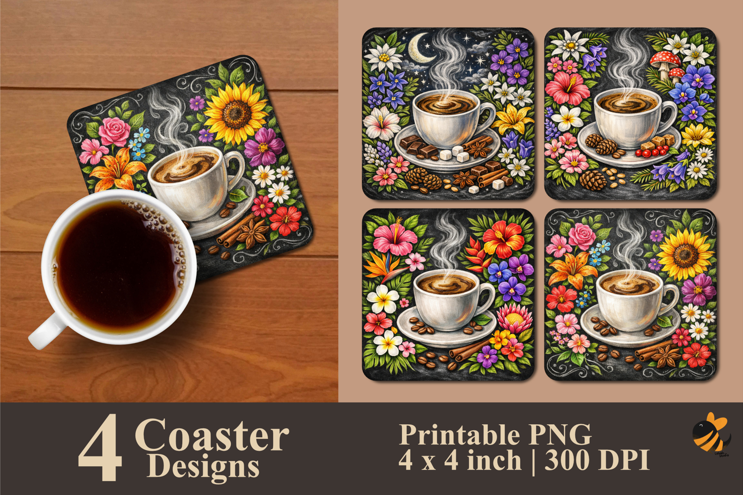 • 4 Coaster design about 4x4 inches around 1200x1200 px PNG files 300 DPI