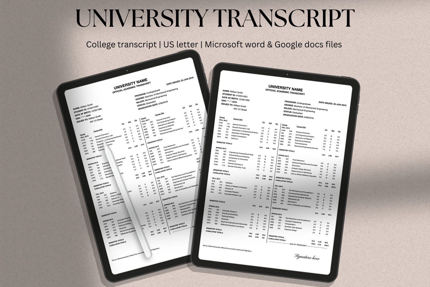 Classic and Authentic looking University and College transcript template in Microsoft Word and Google Docs formats. A simple single page transcript for grade recording also applicable for homeschool transcript form. The editable and customisable files allow to adjust color, fonts, sizes, styles and add or delete components. Customize to showcase your grades in a classic, tidy and clean view form.
