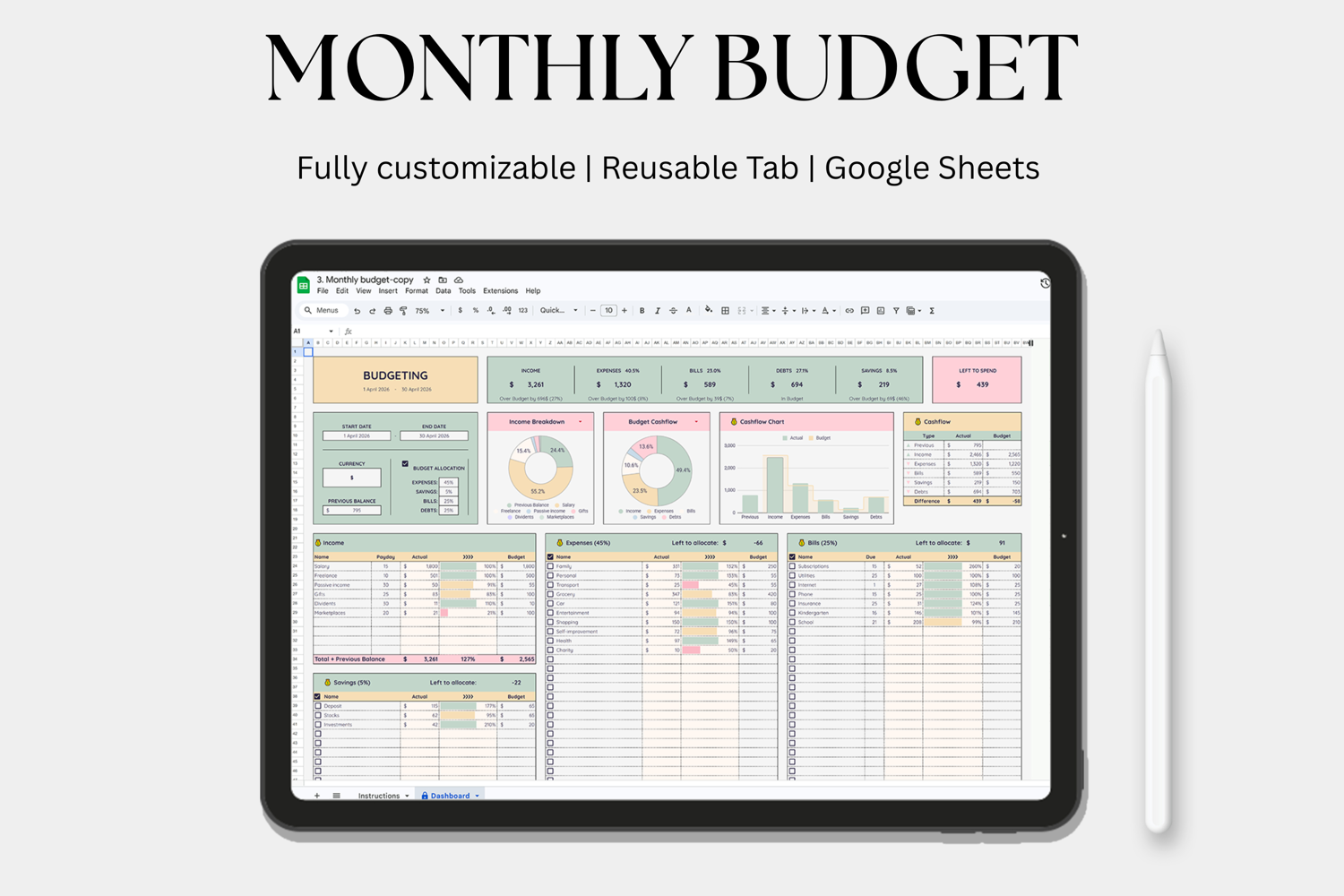 Set your income, allocate expenses, and organize your finances at the start of each month with a clean, easy-to-use layout.