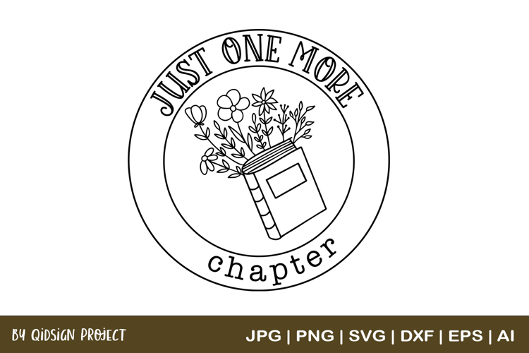 Just One More Chapter SVG is a cozy and relatable reading-themed design featuring a circular badge layout with a hand-drawn book illustration and delicate floral elements growing from the pages. This design captures the familiar feeling every reader knows — promising to read just one more chapter and ending up finishing the whole book.