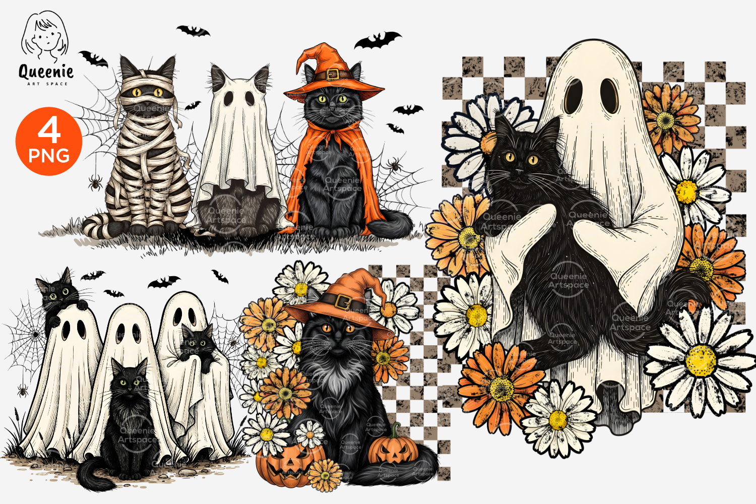Celebrate this spooky season with this charming Halloween cat PNG set! Featuring adorable black cats dressed as ghosts, witches, and mummies surrounded by pumpkins, daisies, cobwebs, and bats.