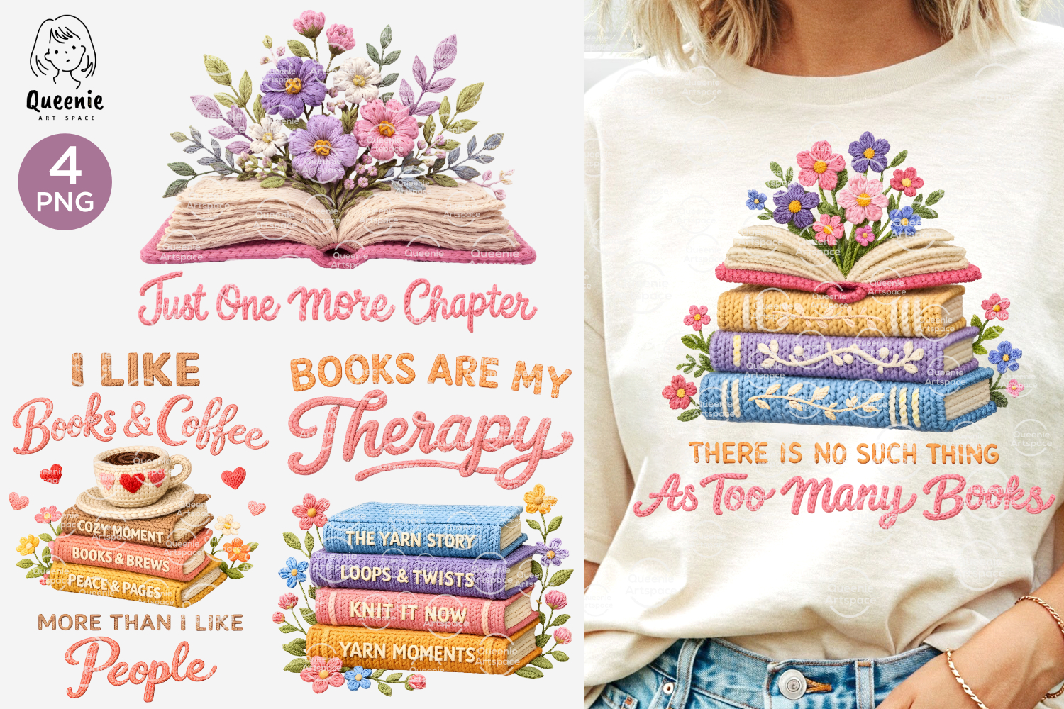 This cozy book lover design created in faux yarn, crochet, and knit embroidery style with soft floral details with the quotes like “There Is No Such Thing As Too Many Books”, "Books are My Therapy", "Just One More Chapter" in textured handcrafted lettering for a warm bookish feel.