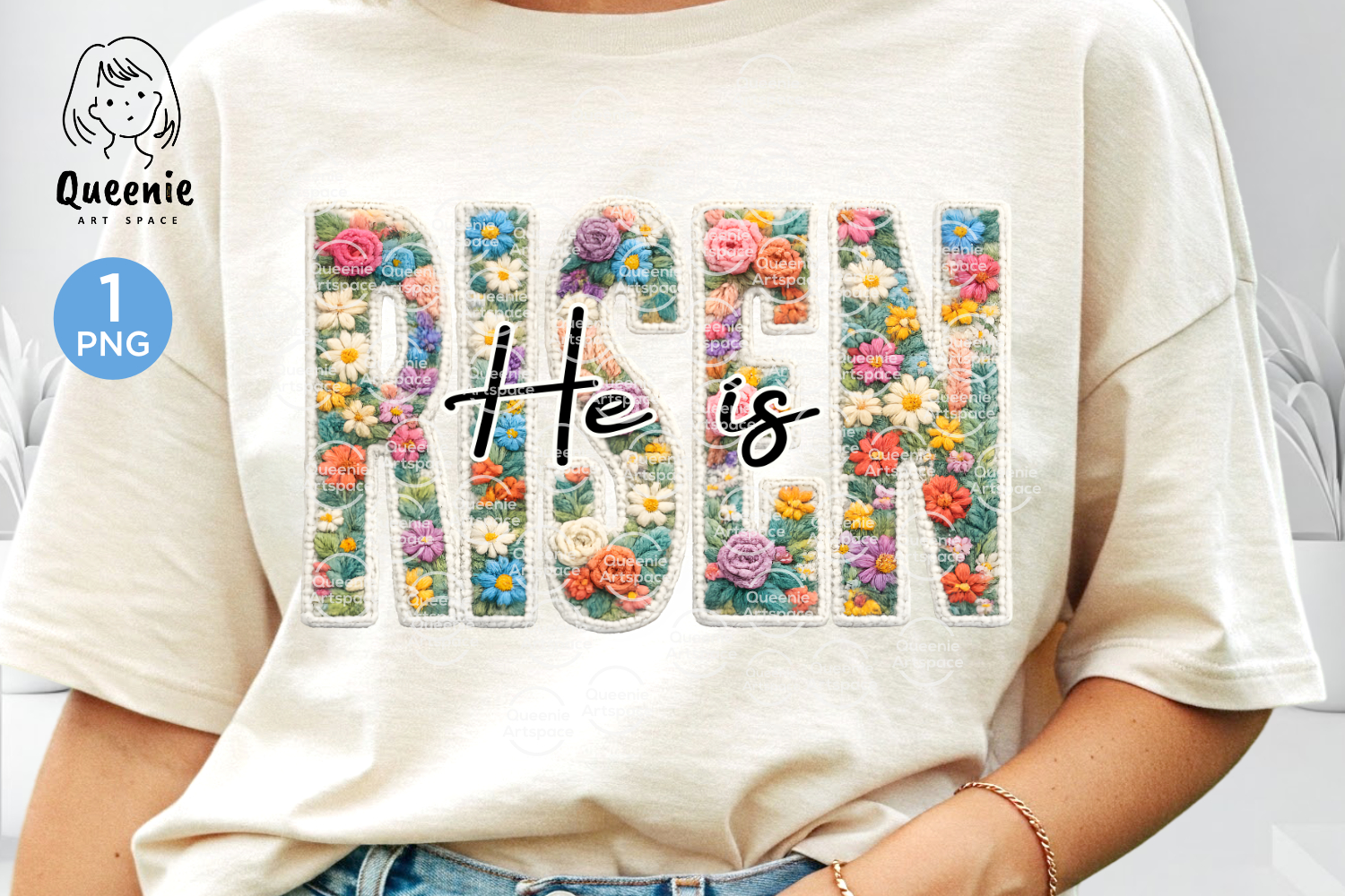 Celebrate the true meaning of Easter with this beautiful “He Is Risen” floral yarn embroidery design. The bold RISEN letters are filled with vibrant spring flowers and detailed faux embroidery texture, paired with a soft handwritten “He is” script for a cozy, handmade look.