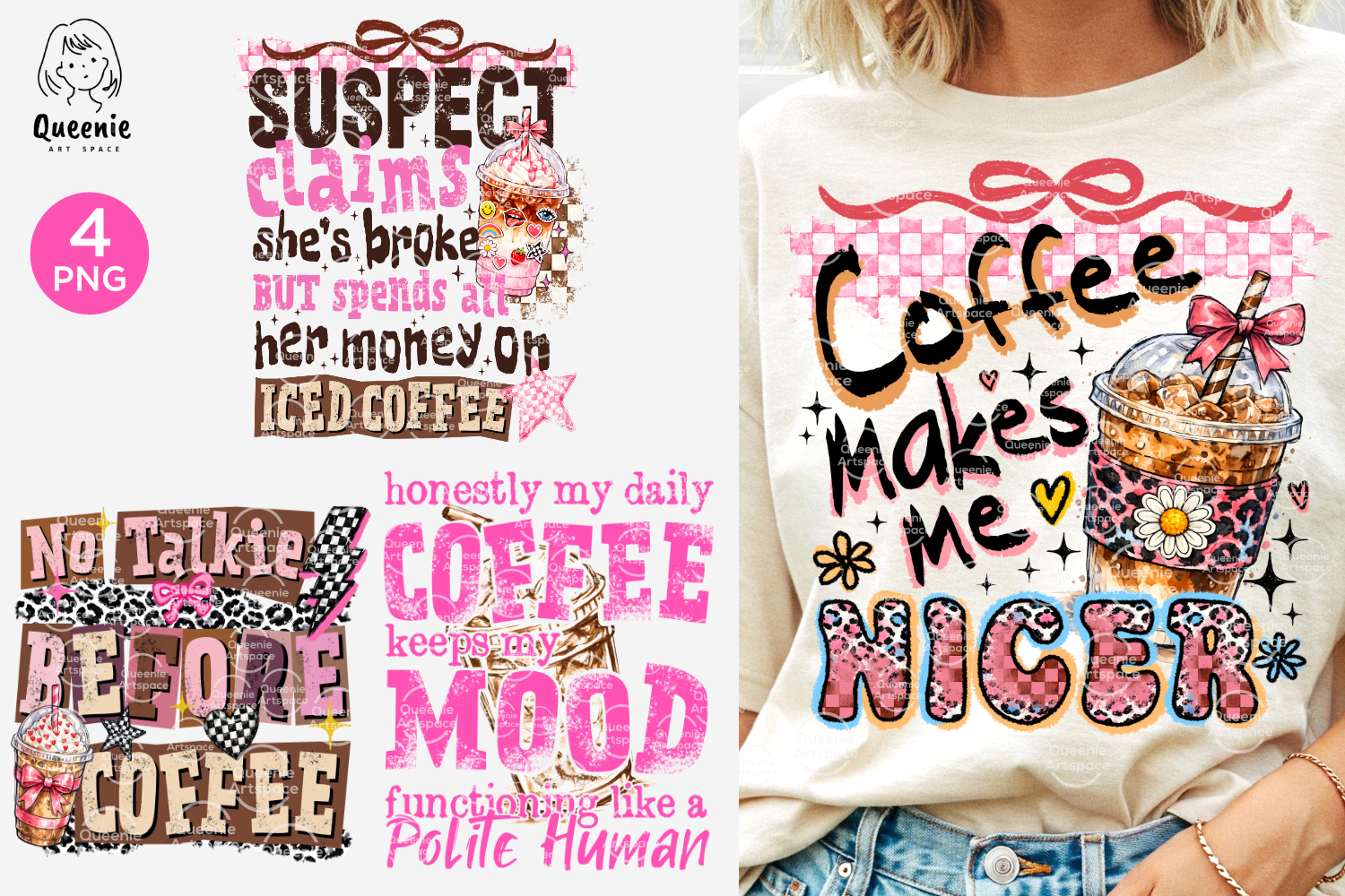 This fun coffee quote bundle includes 4 stylish coffee-themed designs perfect for coffee lovers and caffeine enthusiasts. The set features playful sayings like “Coffee Makes Me Nicer,” “No Talkie Before Coffee,” “Suspect Claims She’s Broke But Spends All Her Money on Iced Coffee,” and “Honestly My Daily Coffee Keeps My Mood Functioning Like a Polite Human.” Each design includes cute coffee illustrations, trendy patterns like leopard print and checkered backgrounds, bows, sparkles, and fun hand-drawn lettering.