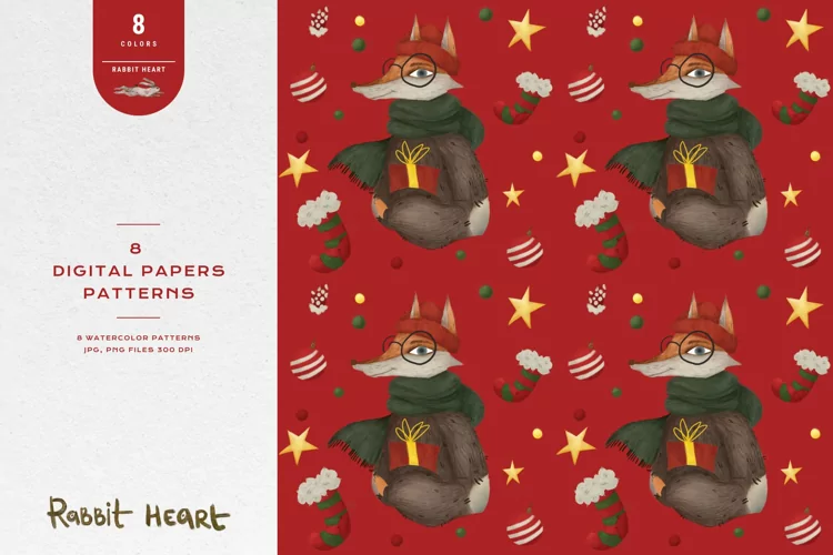 Christmas Fox - Watercolor Patterns Set - 8 Hand Painted Watercolor Seamless Patterns.