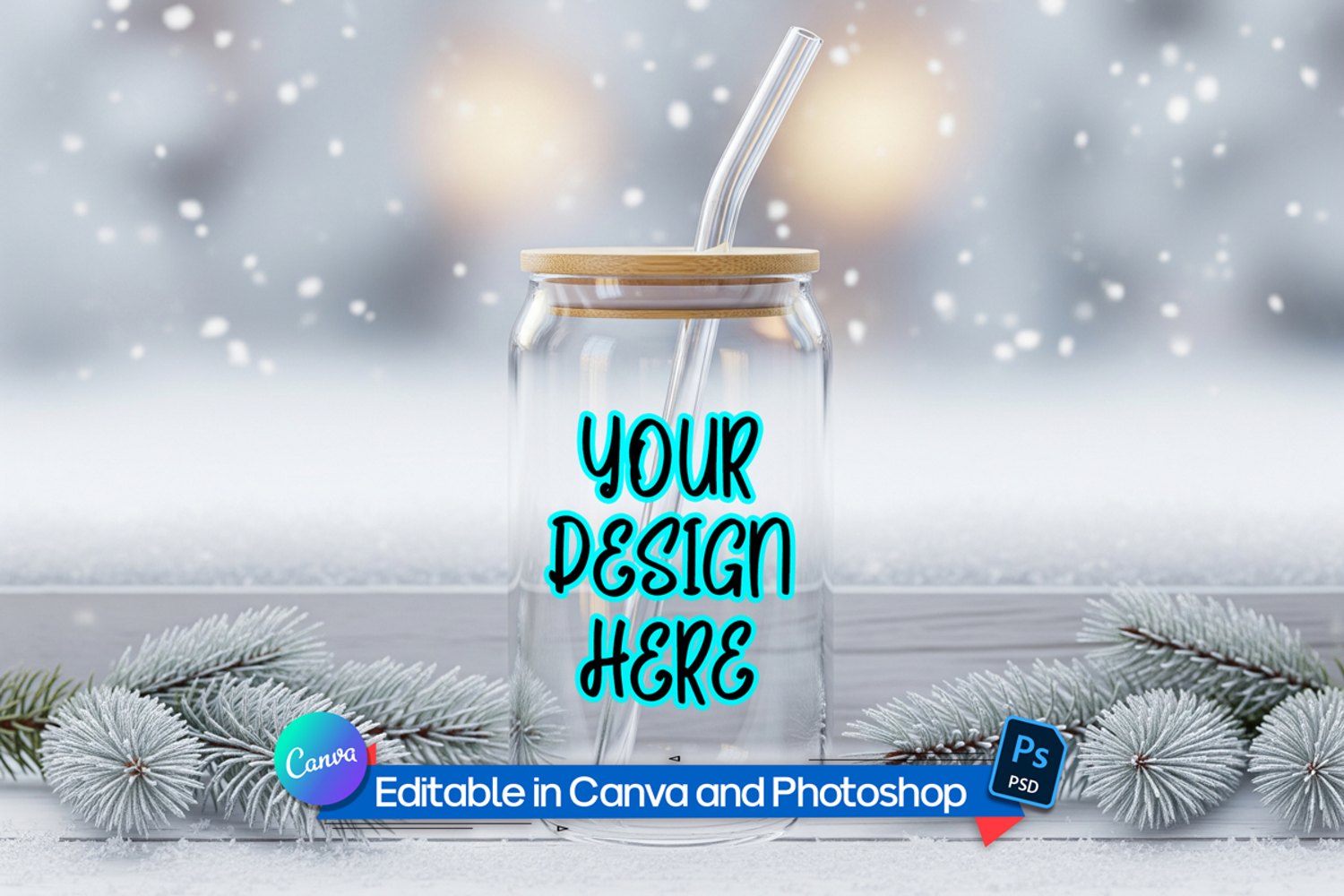Present your artwork, patterns, or branding concepts with the Premium Glass Can Mockup — a high-resolution, editable mockup designed to display your designs on a modern, eco-friendly glass can with a bamboo lid and straw. Perfect for sublimation artists, vinyl crafters, and print-on-demand sellers, this mockup transforms your creations into polished, professional, and eye-catching presentations.