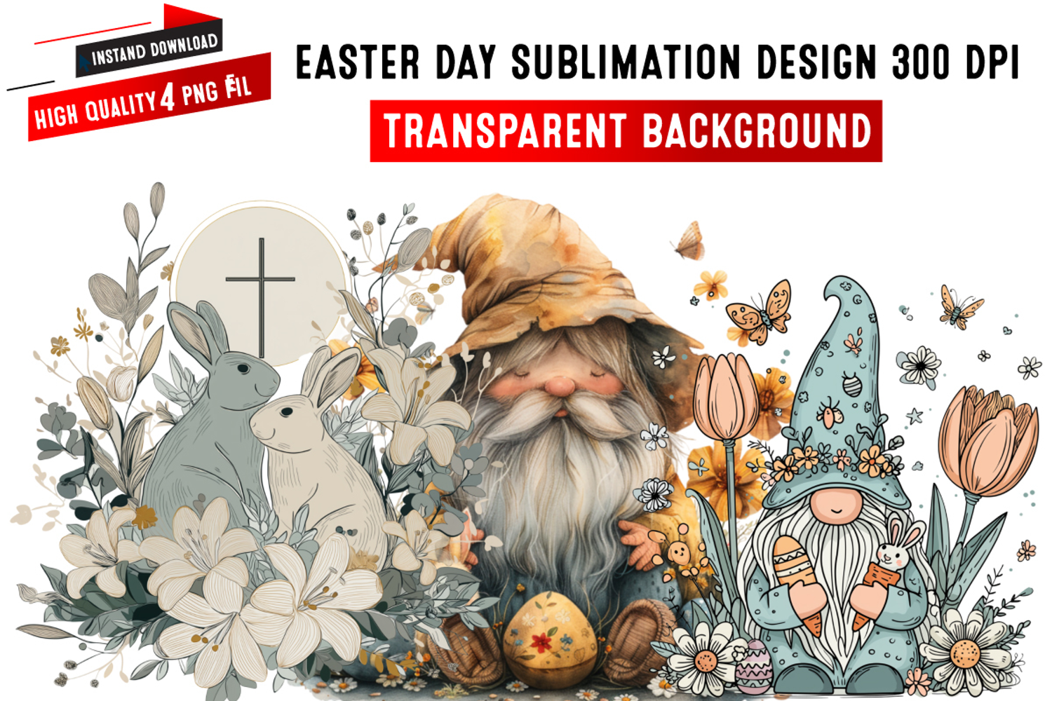 Vintage Spring Rabbit With Floral Gnomes,Easter Sublimation