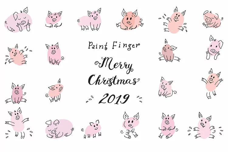Zodiac Symbol of the New Year 2019 Piggy pink fun Fingerprint collection drawings of Piglets Greeting cards of  the Christmas 2019 Lettering