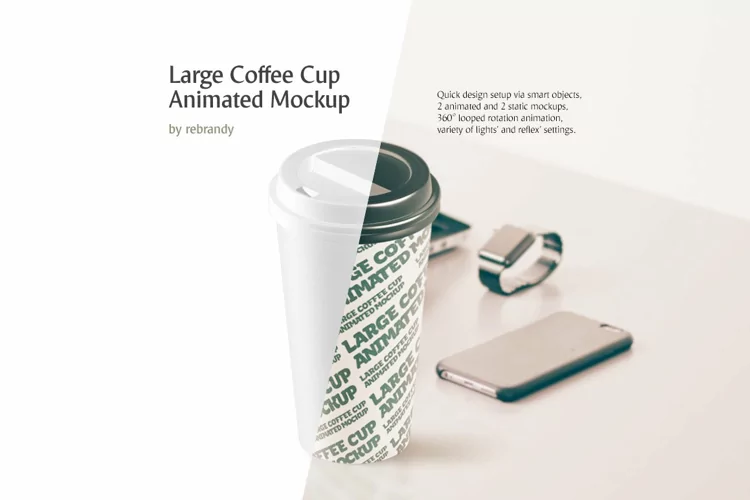 Showcase a branding design and relate to your potential consumers by simply uploading an image onto the template. A fully editable layered design of both animated and static cups allows you to customize the interface of your item according to your needs. Create your mockup by adjusting color and design, controlling levels of gloss, glare, backlight and backdrop reflections of your cup.