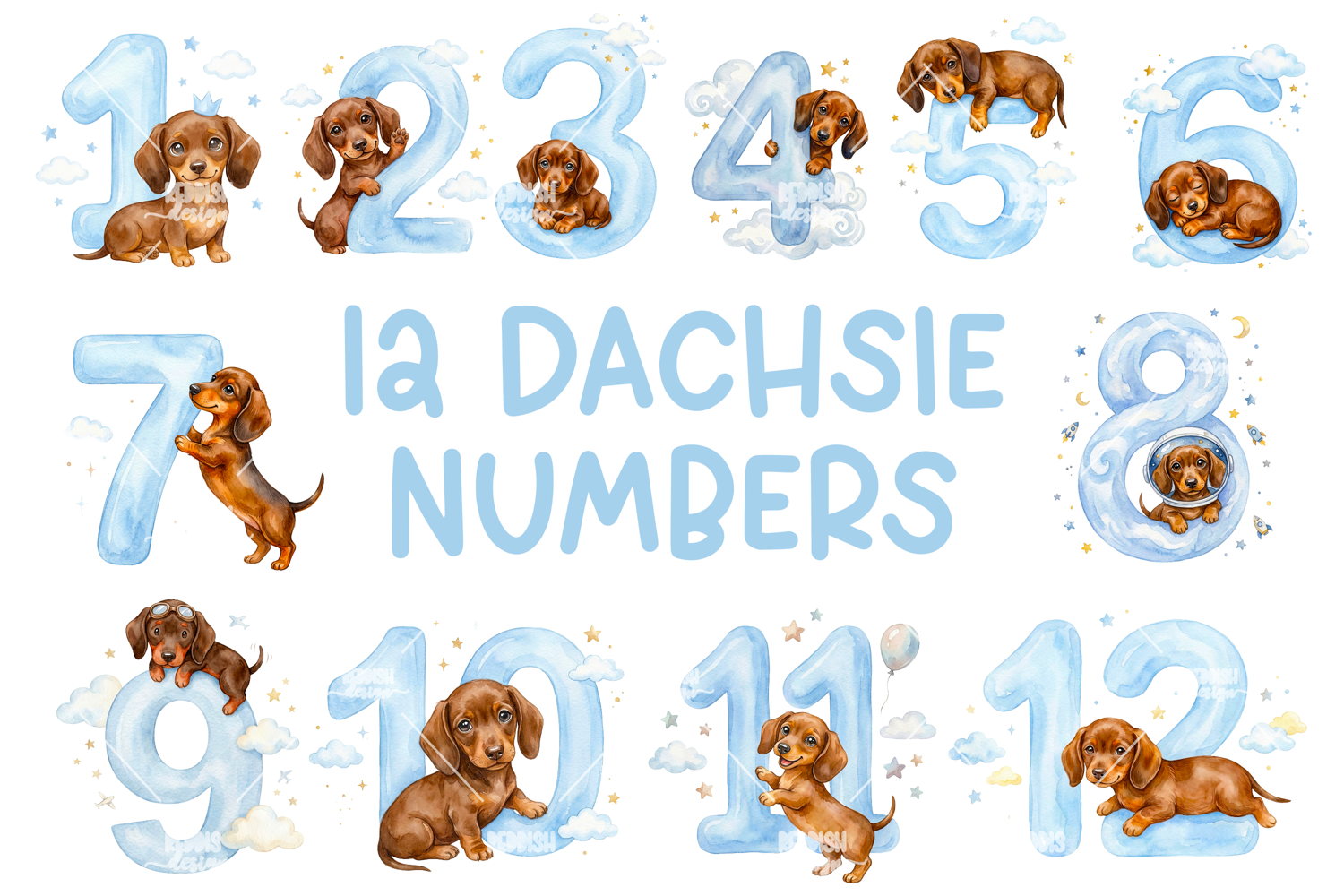 Similar Design Products to 1-12 Dachshund Numbers Watercolor Clipart
