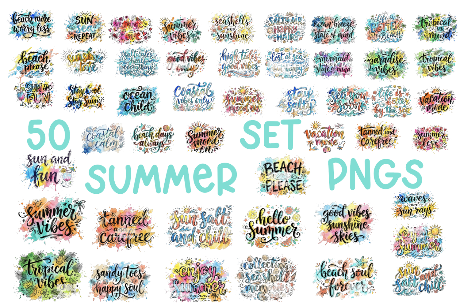 50 Super Summer Quotes Watercolor Cliparts Bundle