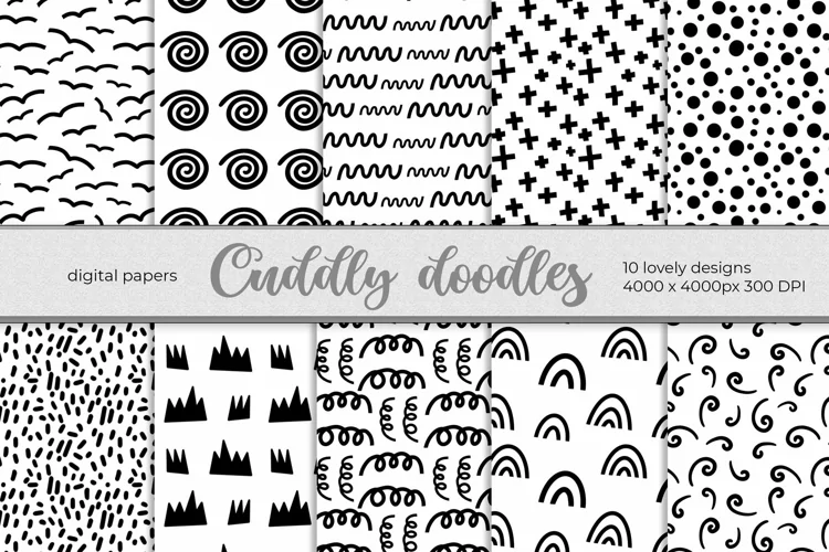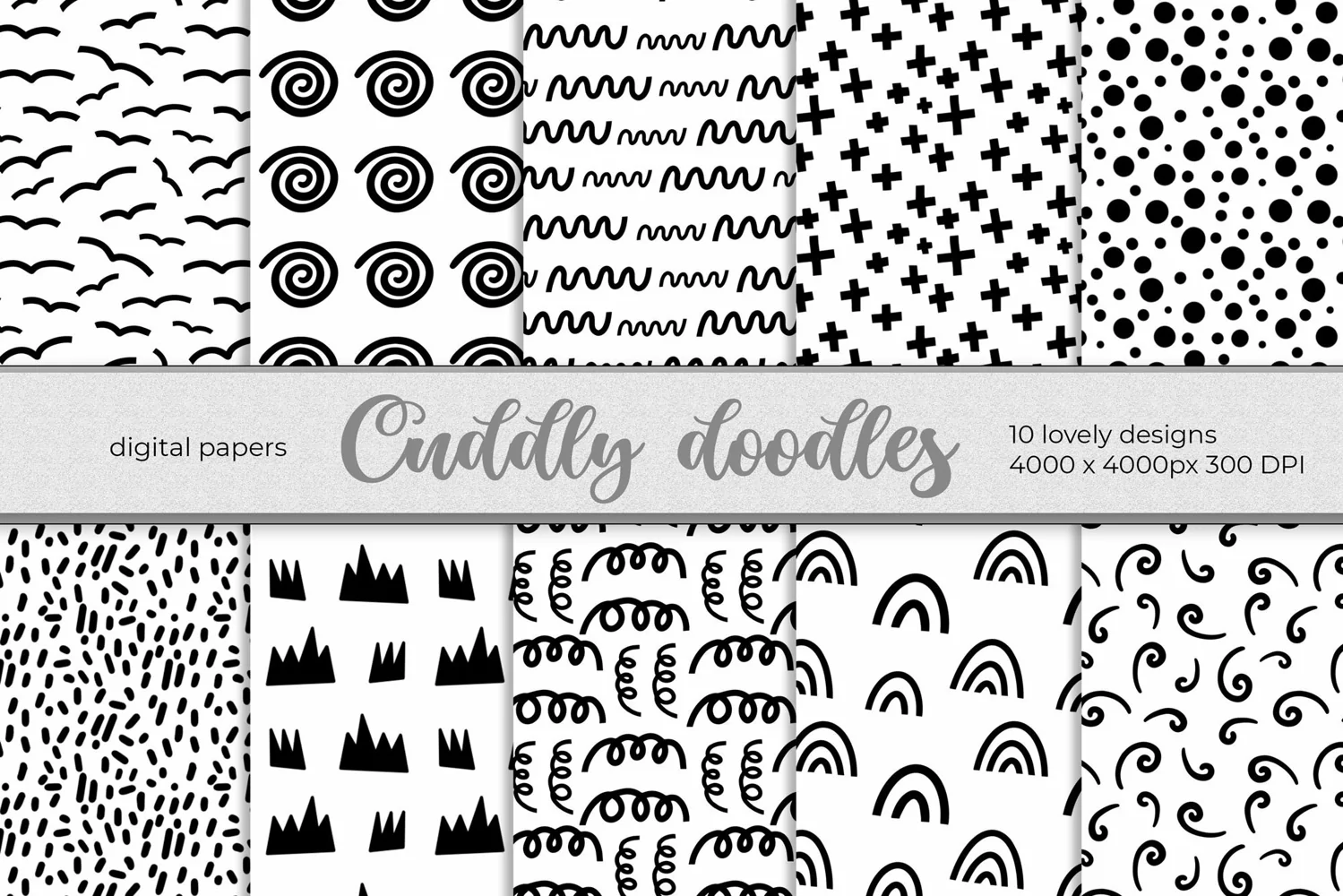 Cuddly doodles papers. Set of 10! Digital Papers black and white patterns. Scandinavian Doodle Patterns.