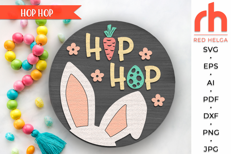 Hop Hop SVG, Layered Easter Door Sign Cut File, Silhouette of Bunny Ears, Spring Round Hanger DXF - Cricut cut file, Silhouette cut file