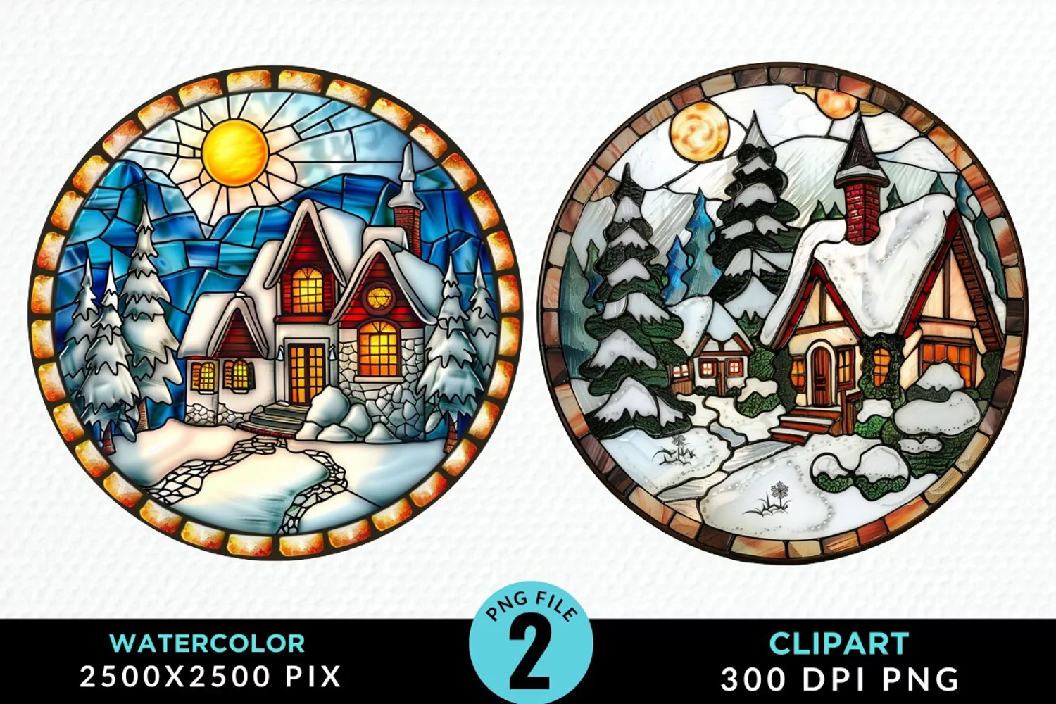 Stained Glass Cozy Winter Houses Exquisite Clipart example image 1