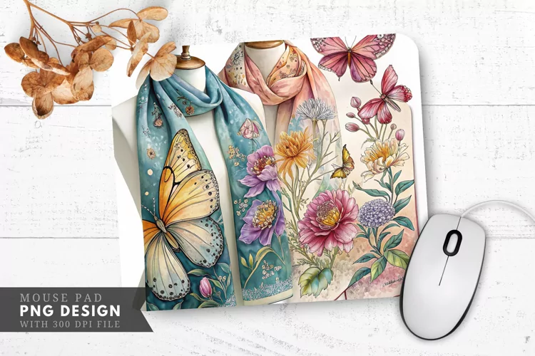Butterfly And Floral Silk Scarf Mouse Pad PNG Design example image 1
