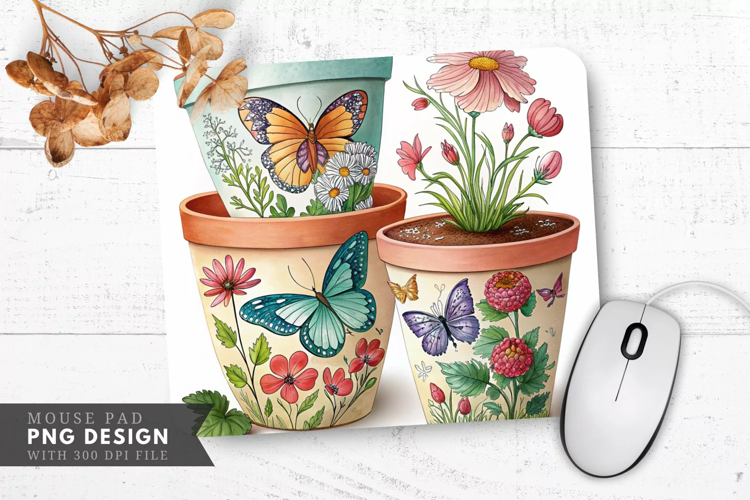 Butterfly and Floral Hand Painted Plant Pots Mouse Pad PNG