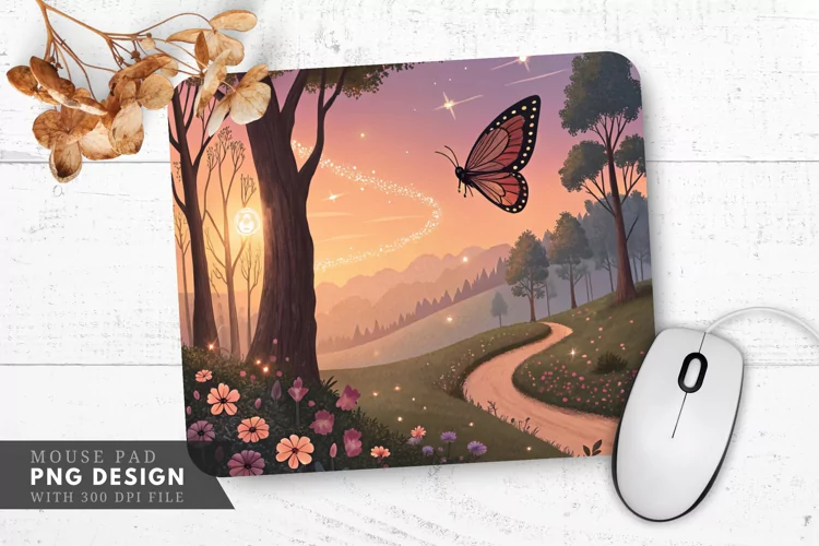 Whimsical Fairytale Butterfly Landscape Mouse Pad PNG Design example image 1