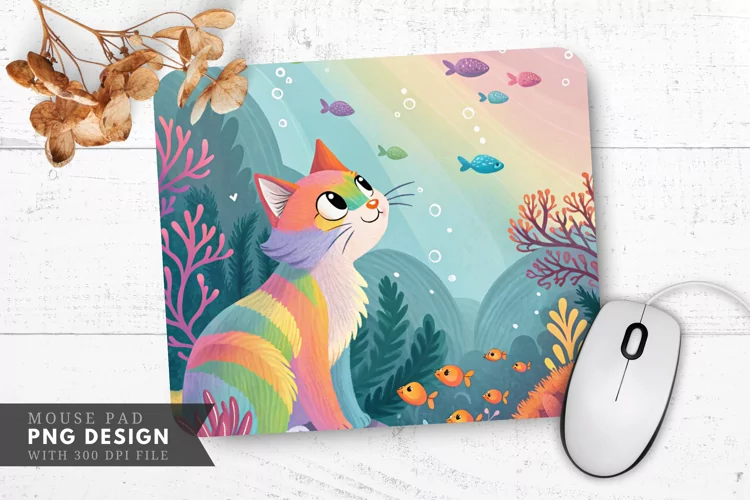 Underwater Rainbow Cat Mouse Pad PNG Design
