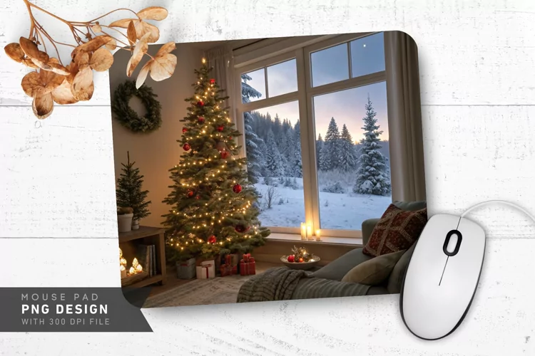 Cozy Christmas Living Room with Snowy Mouse Pad PNG Design example image 1