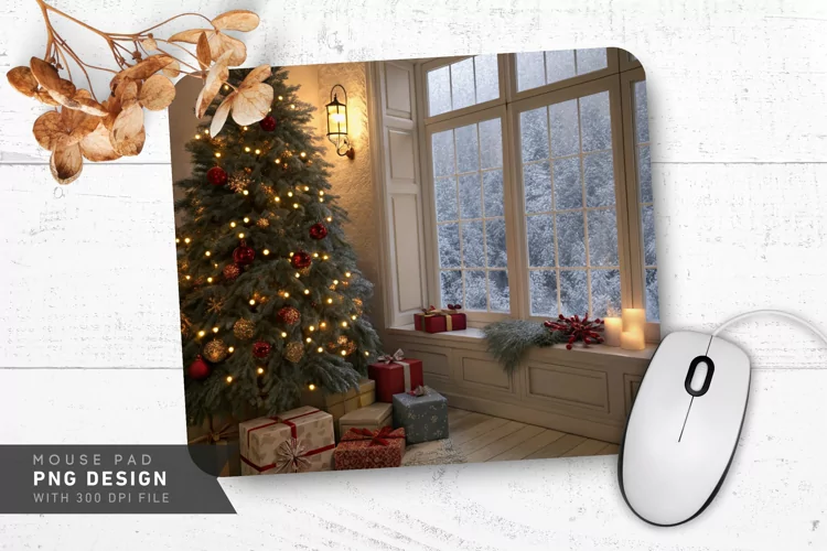 Cozy Christmas Morning with Tree and Gifts Mouse Pad PNG example image 1
