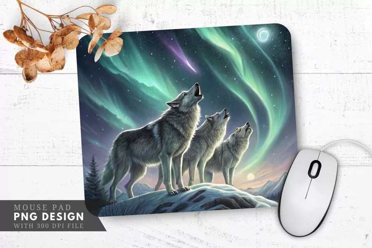 Silver Wolves Under Aurora Mouse Pad PNG Design