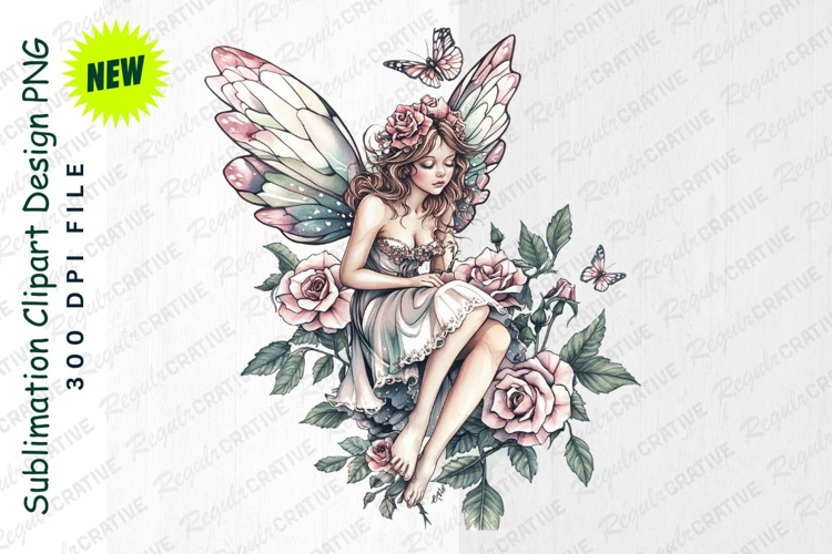 Watercolor Fairy Sitting On Roses With Butterflies Clipart example image 1