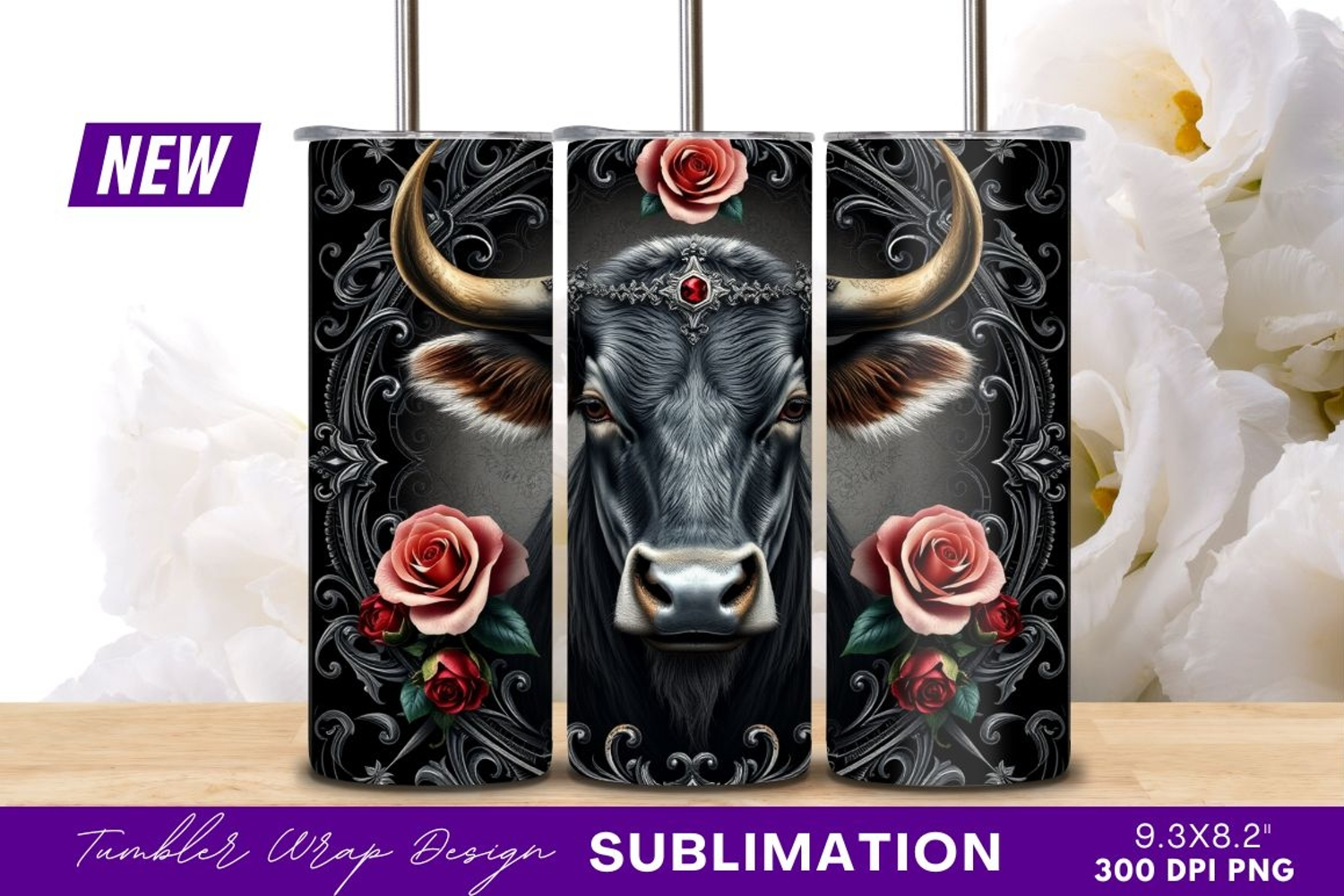 Similar Design Products to Ornate Bull Portrait With Roses Tumbler Png
