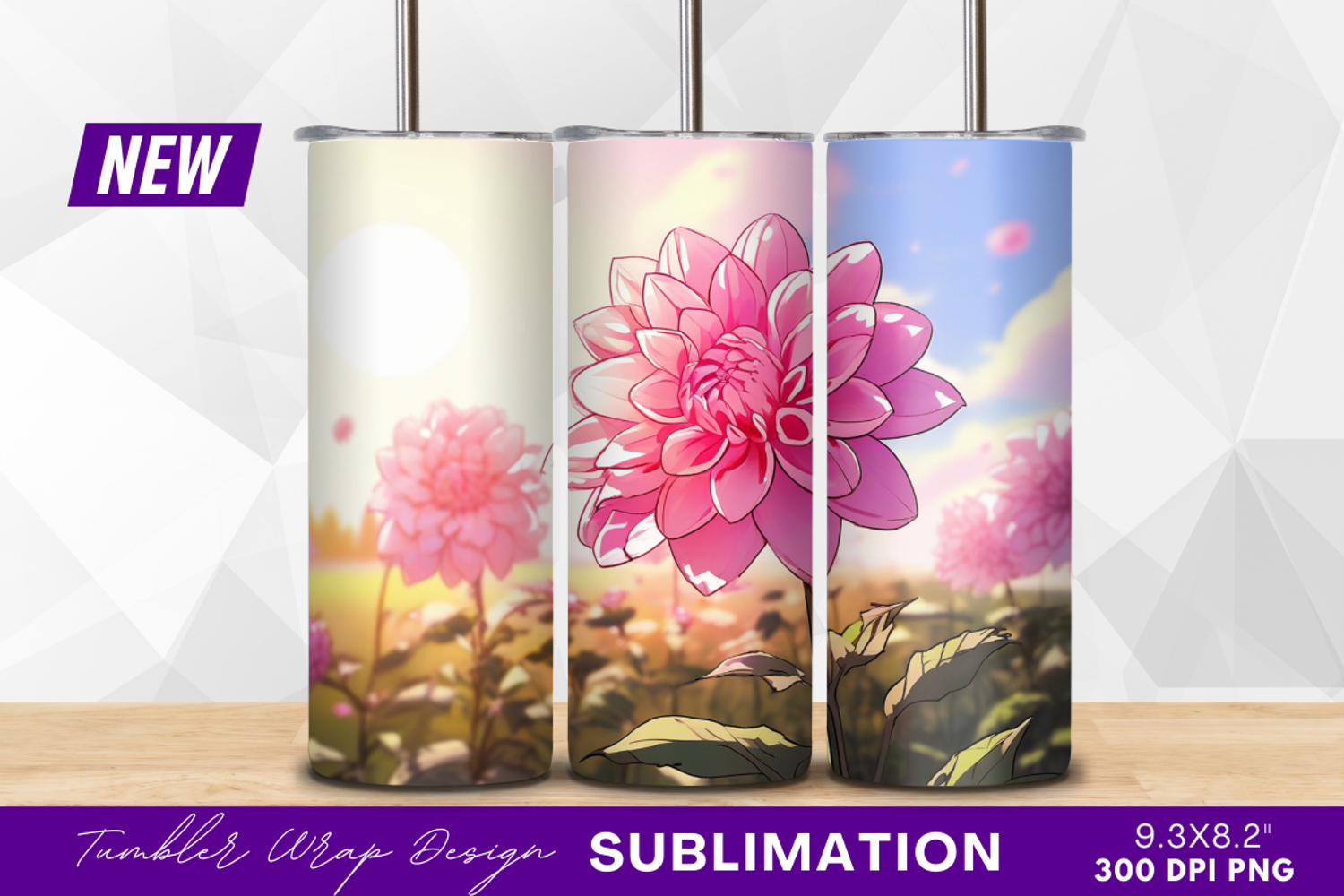 Pink dahlia flower field in sunlight tumbler png example image 1