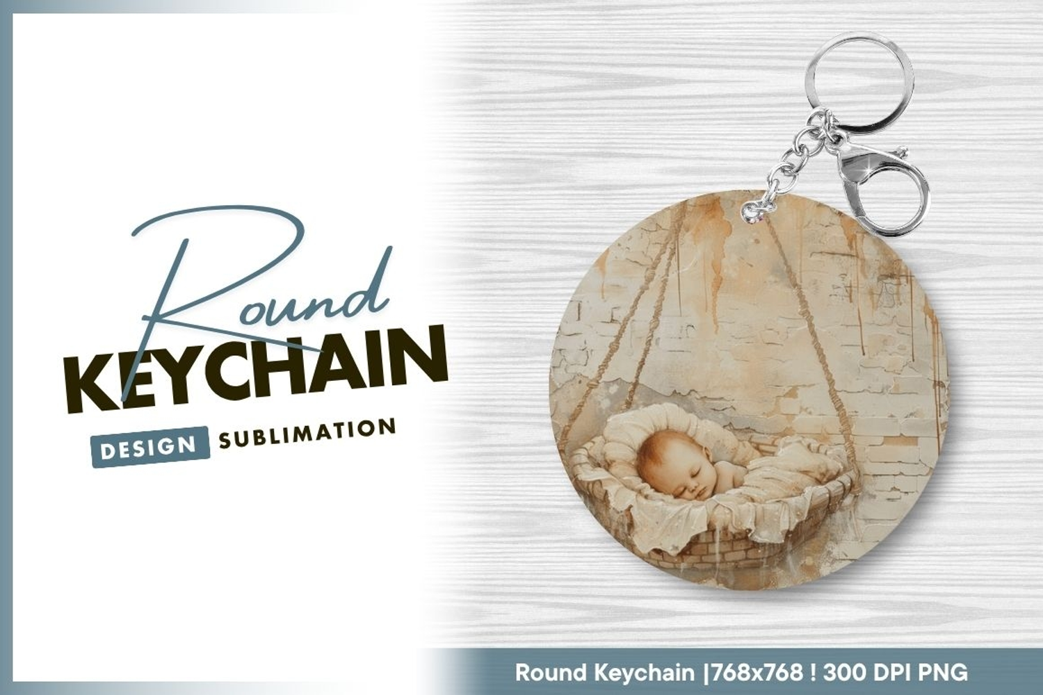 Illustration Watercolor Design Baby Nursery Basket Newborn Sleeping Cradle Round Keychain Png
