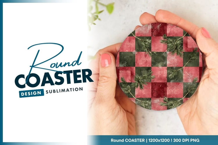 Festive checkered pattern with fir branches round coaster example image 1