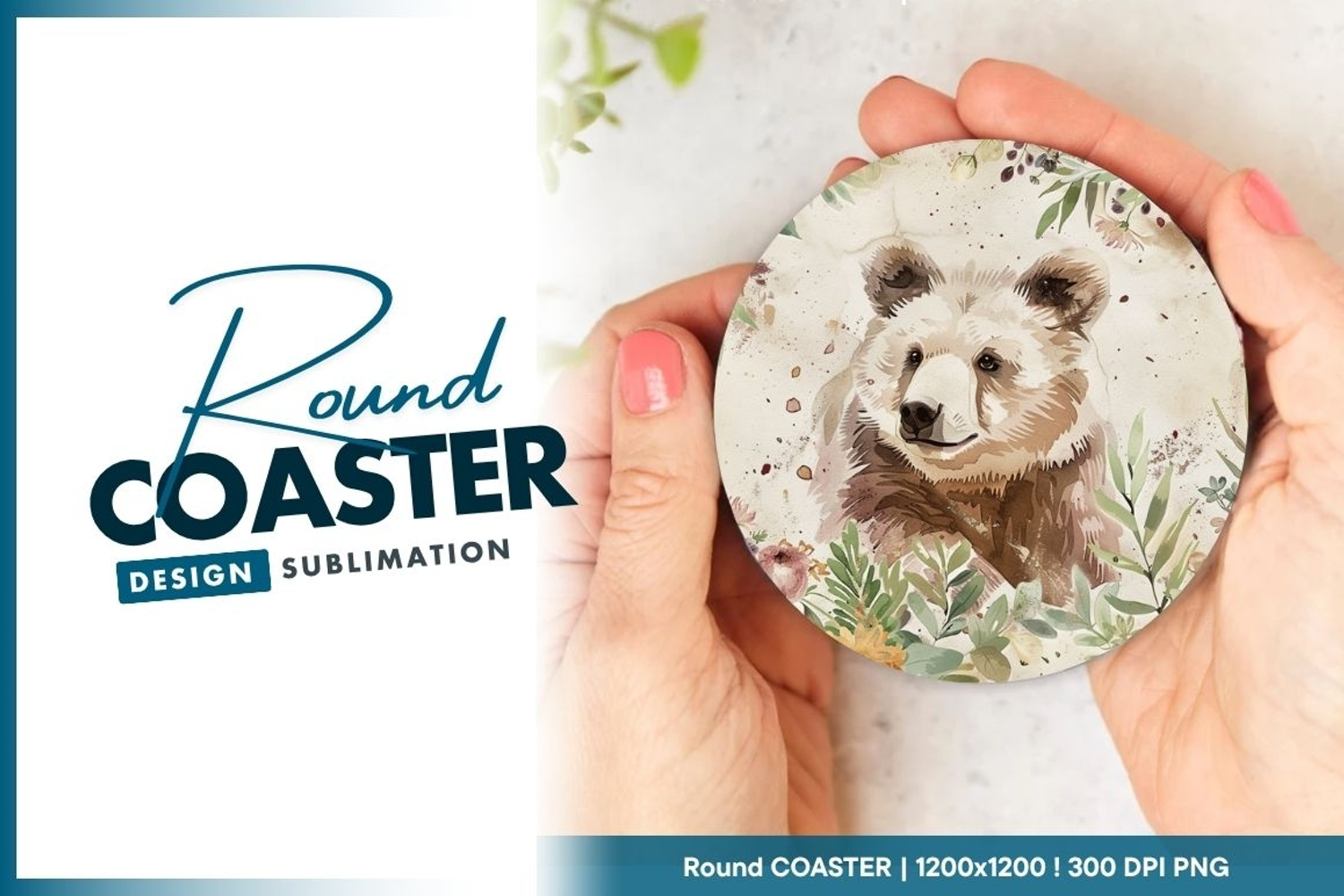 Watercolor Bear Portrait With Floral Round Coaster example image 1