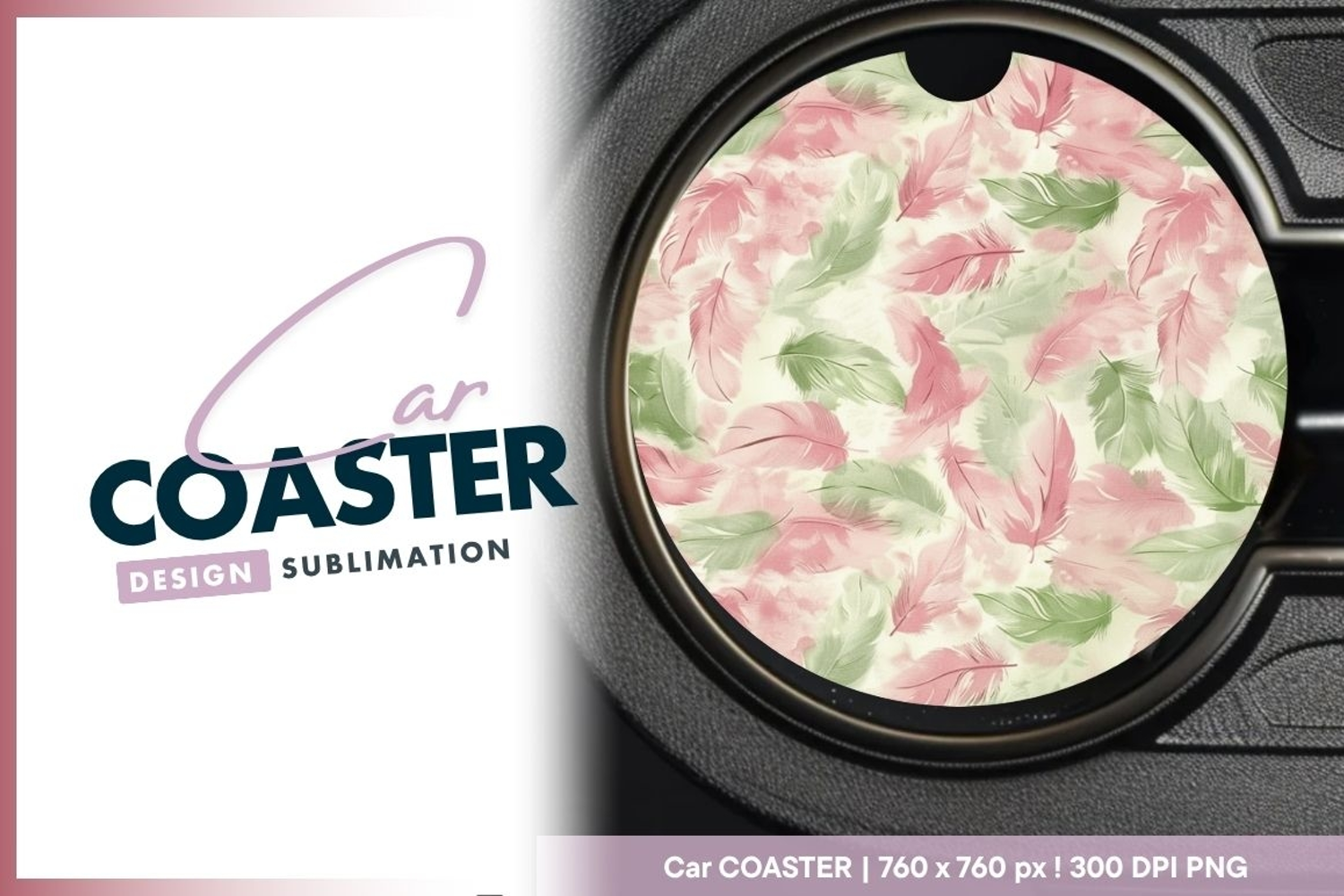 Pink and Green Feather Pattern on Round Car Coaster Png example image 1