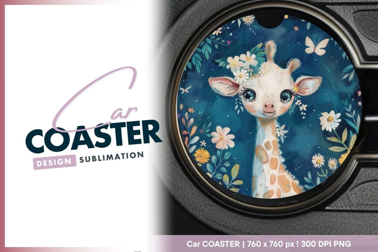 Adorable Giraffe Illustration with Flowers Round Car Coaster example image 1