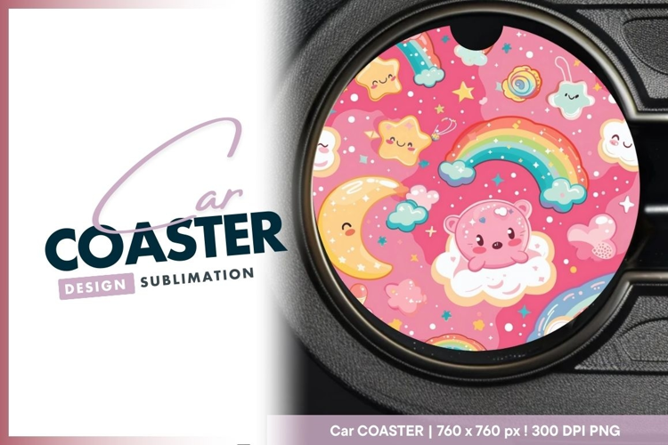 Illustration Cartoon Whimsical Cute Pink Bear Rainbow Clouds Stars Round Car Coaster Png