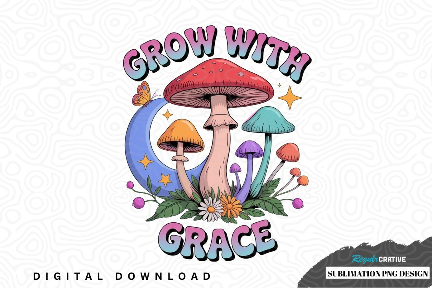 Grow with grace mushroom sublimation png design was created by hand and then converted to a digital file.