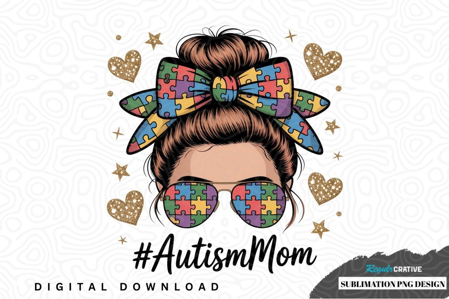 Hearts Sunglasses Stars Mother Bun Support Puzzle Piece Autism Awareness Autism Mom Sublimation Png Design