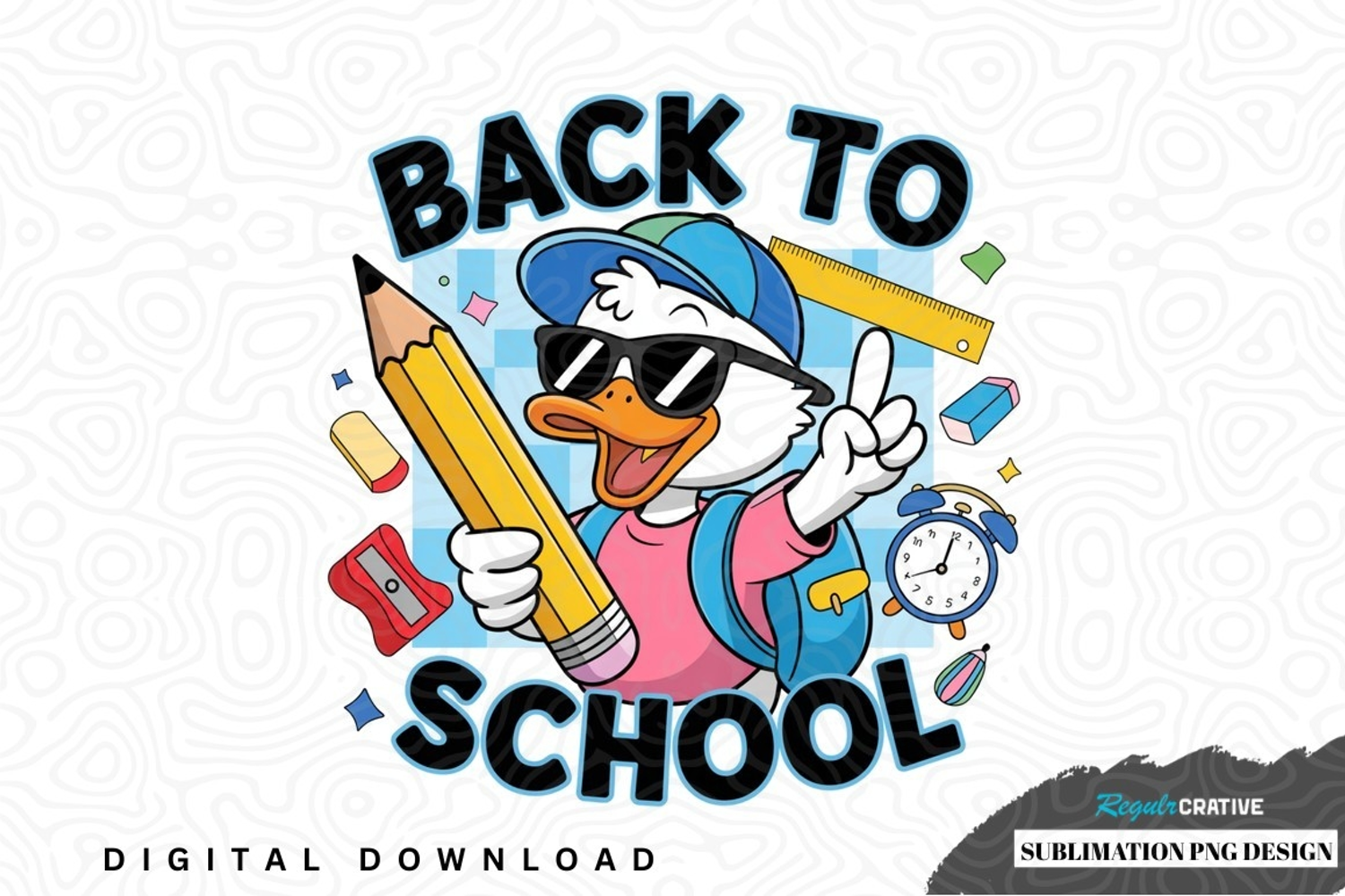 Pencil Backpack Back To School Eraser School Supplies Ruler Alarm Clock Pencil Sharpener Sublimation Design Cartoon Duck