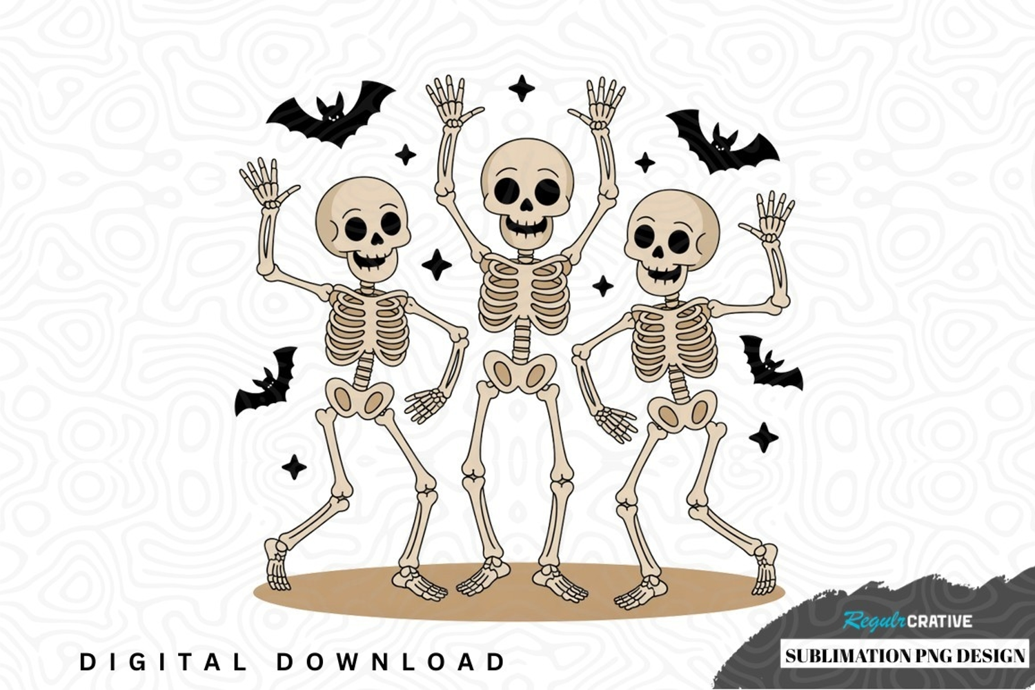 Dancing skeleton trio halloween sublimation png design was created by hand and then converted to a digital file.
