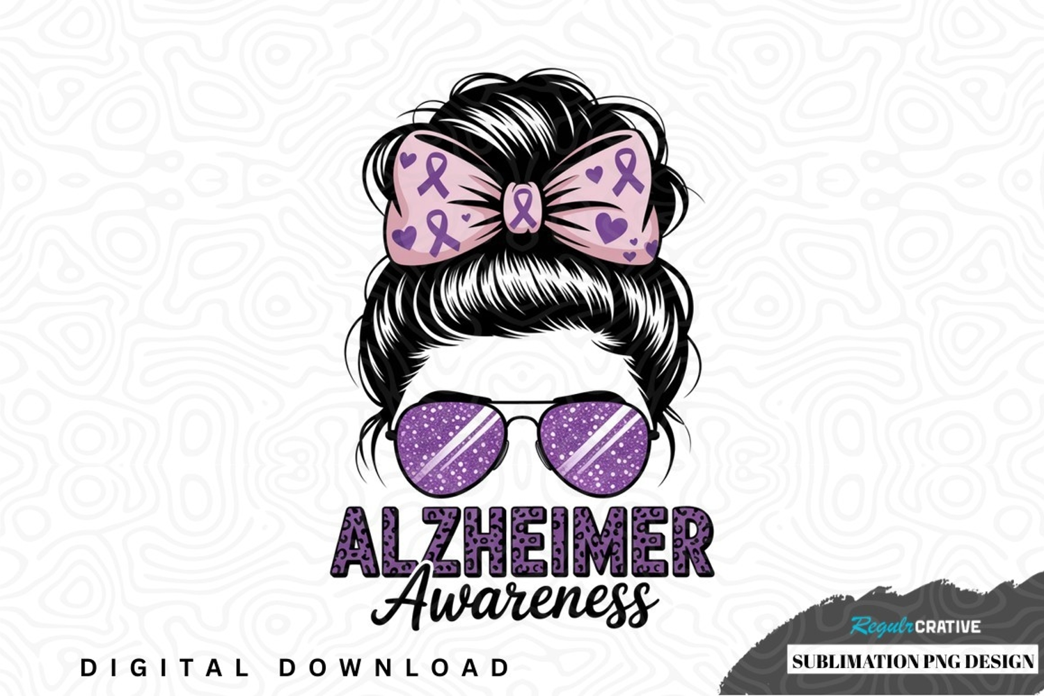 Hearts Awareness Ribbon Messy Bun Alzheimer's Awareness Purple Ribbon Sublimation Png Design Causes Awareness Campaign Support Alzheimer's Polka Dotted Sunglasses
