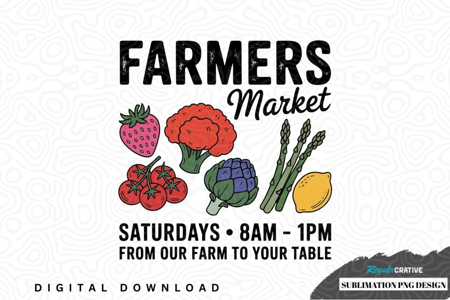 Farmers market sublimation png design was created by hand and then converted to a digital file.