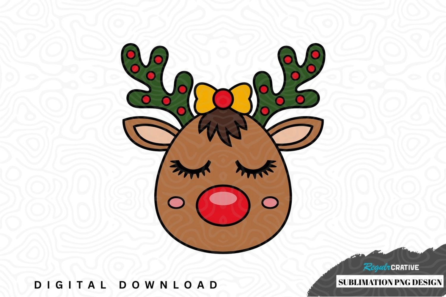 Holiday Christmas Bow Antlers Reindeer Festive Reindeer Face Digital Illustration Sublimation Design Red Nose