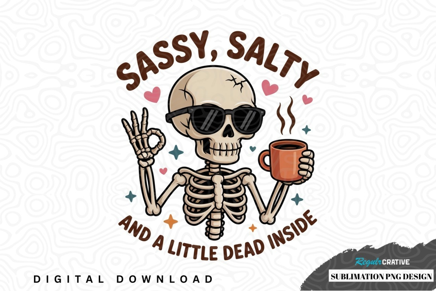 Sassy, salty skeleton sublimation png design was created by hand and then converted to a digital file.