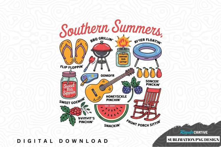 Watermelon Mason Jar Bbq Grill Flip Flops Sweet Tea Summer Theme Rocking Chair Sublimation Png Design River Float Southern Summers