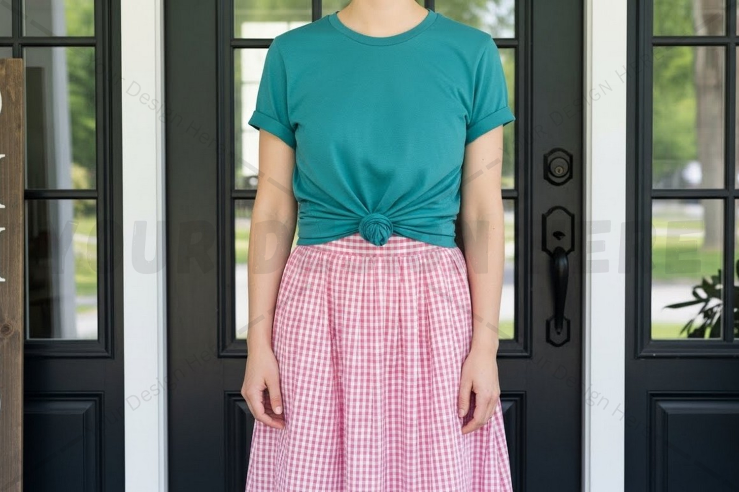 Fashion T-shirt Mockup Teal Front View Red And White Casual Wear Trendy Outfit Checkered Skirt Everyday Styling
