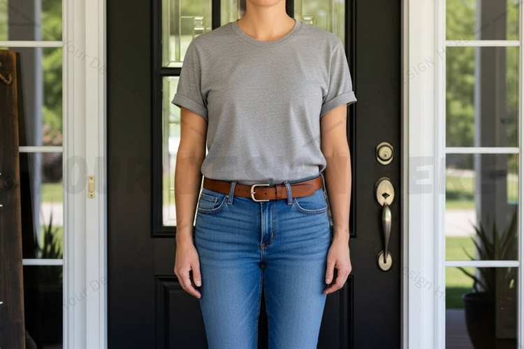 T-shirt Blue Jeans Front Door Grey T-shirt Casual Wear Women's Fashion Brown Belt Casual Outfit Glass Panels