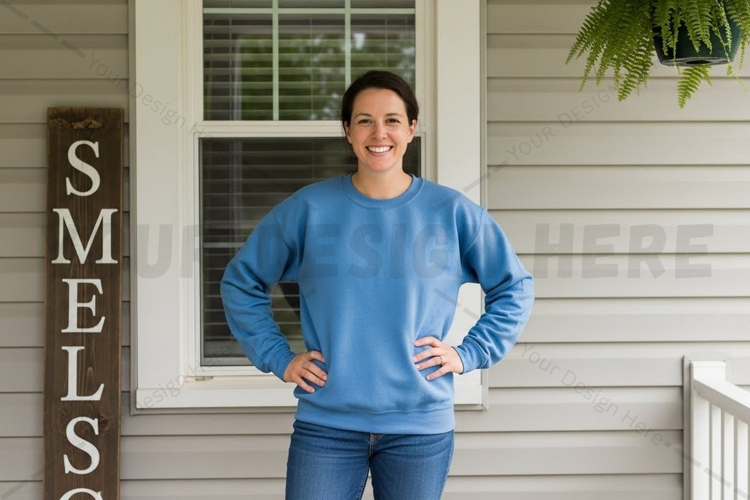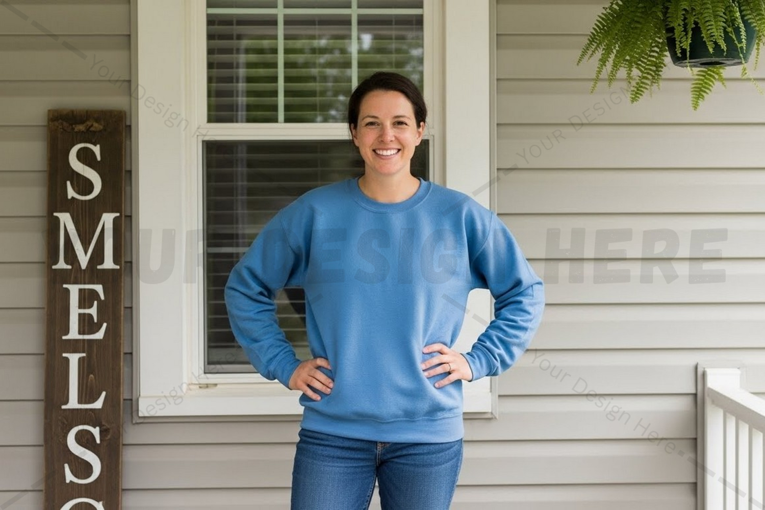 T-shirt Woman Front View House Mockup Design Blue T-shirt Casual Wear Comfortable Design Everyday Wear Casual Outfit