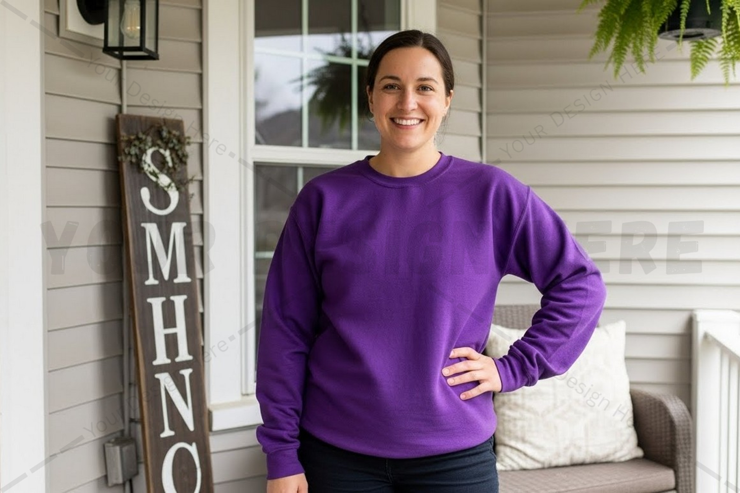 Mockup Woman Outdoor Purple Smiling Sweatshirt Porch Long Sleeves Casual Wear Comfortable Clothing