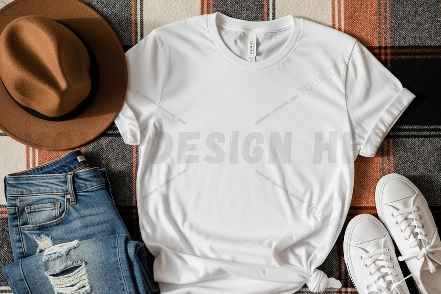 T-shirt Street Style Mockup Design Fashion Accessory White T-shirt Casual Wear Ripped Jeans White Sneakers Casual Outfit Brown Fedora Hat