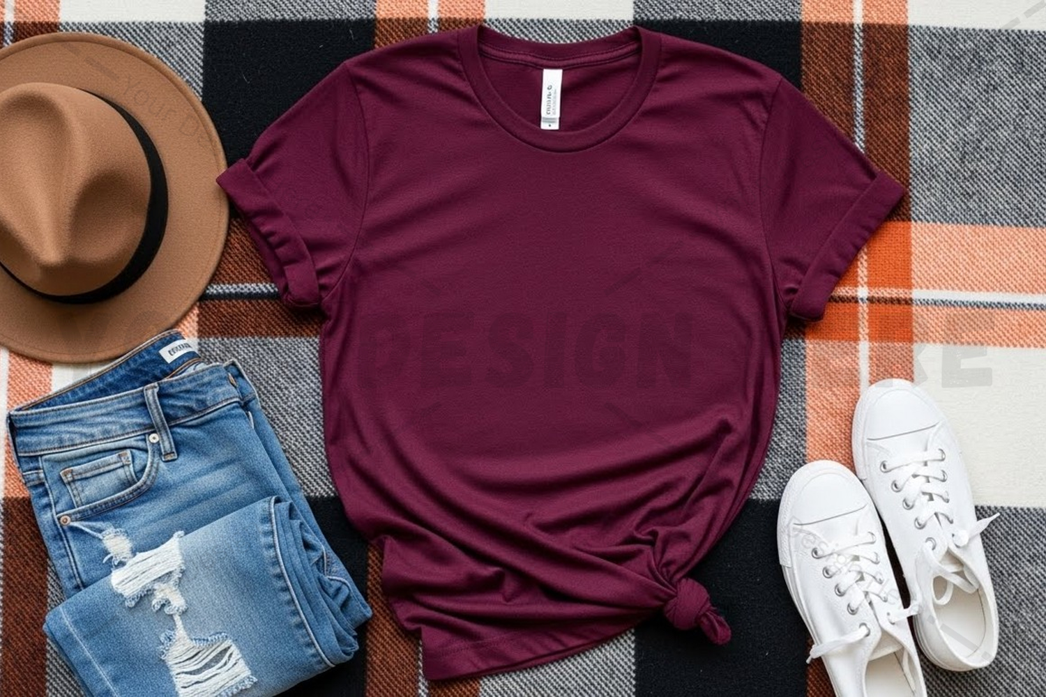 Fashion T-shirt Clothing Mockup Maroon Fedora Hat Plaid Background Ripped Jeans White Sneakers Casual Outfit