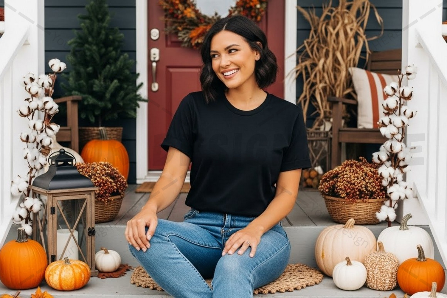Decorative T-shirt Model Autumn Fall Jeans Pumpkins Porch Fall Decorations Black T-shirt